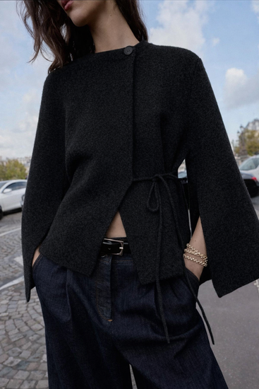 Standart beden önden bağlamalı kolları yırtmaçlı triko hırka