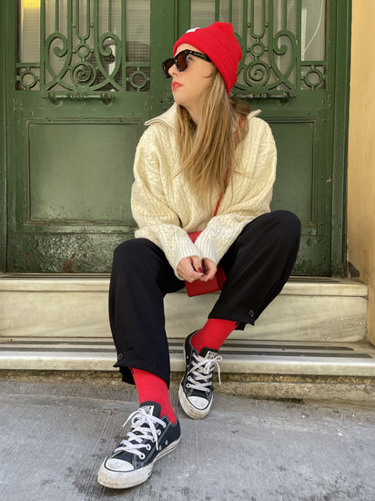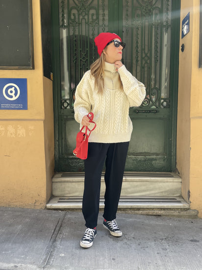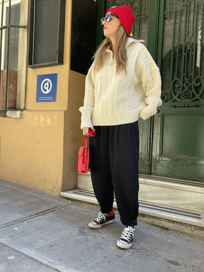 Viscose karışımlı kumaştan, önü fermuarlı ve düğmeli, yan cepli, önü ve paçaları pens detaylı, yüksek bel pantolon.