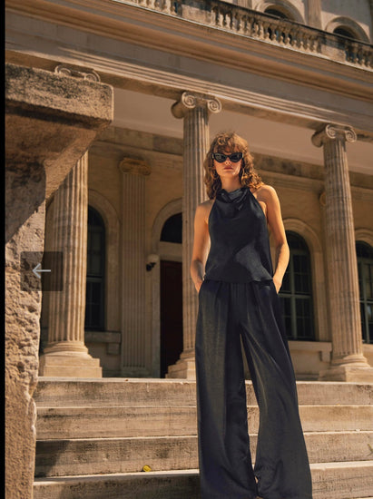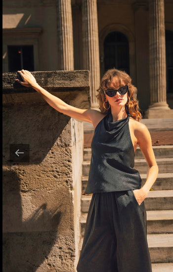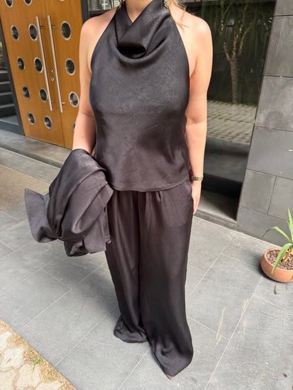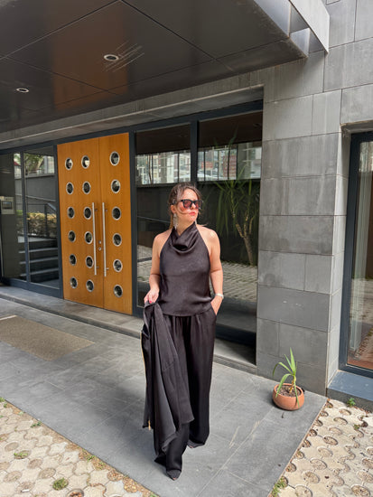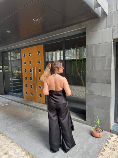 Bluz boyundan bağlamalı sırt dekoltelidir. Tam kalıptır
