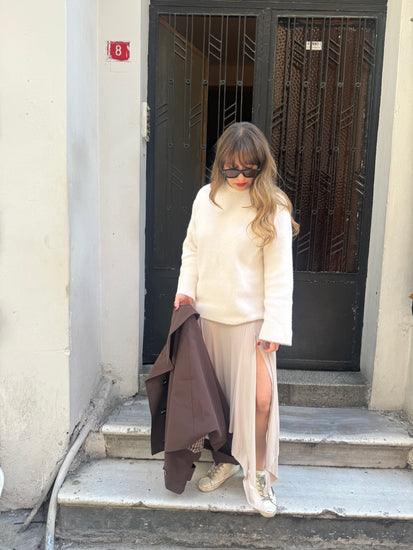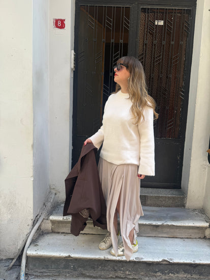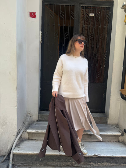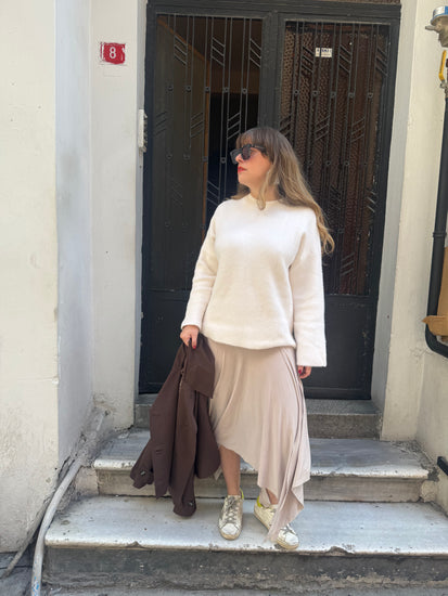 Bel kısmı büzgülü yandan fermuarlı yırtmaçlı asimetrik etek