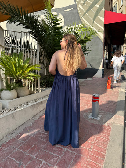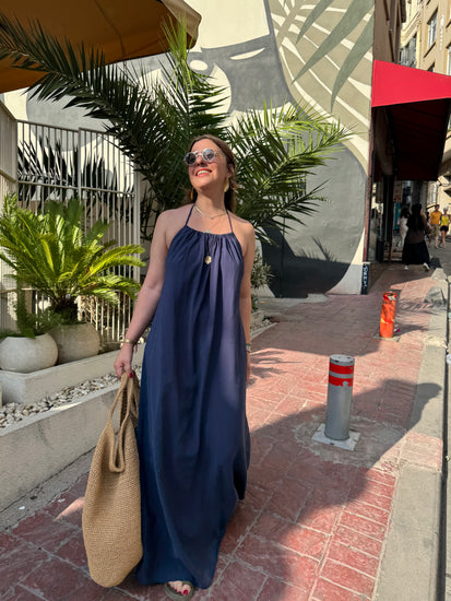 Tensel kumaştır. Sırt detaylı boyundan bağlamalı elbise